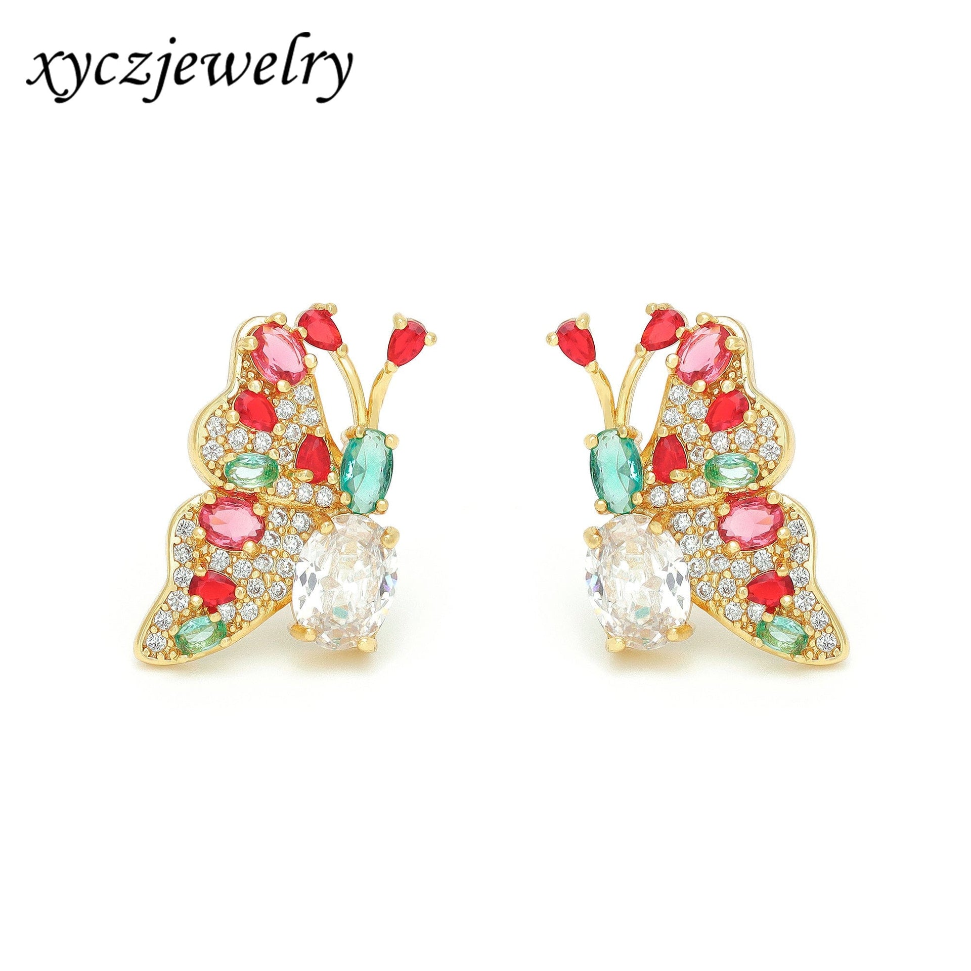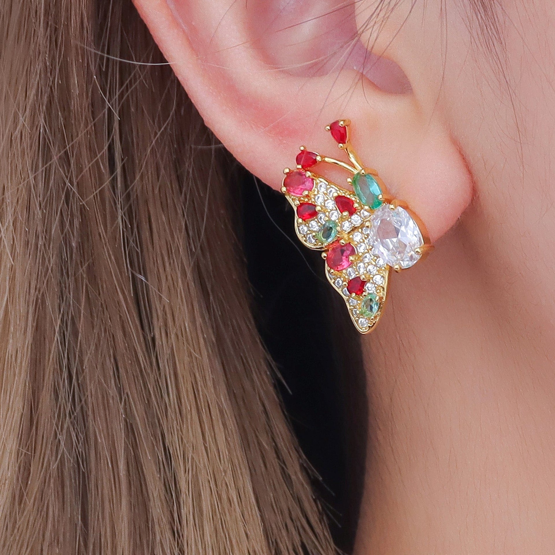 Brinco em latão de alta fusão cravejado manualmente com micro zircônia 5A premium e vidro lapidado, nas opções de banho Ouro 18k, Ródio branco ou Bruto.