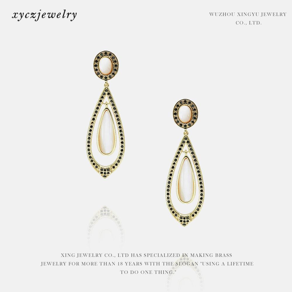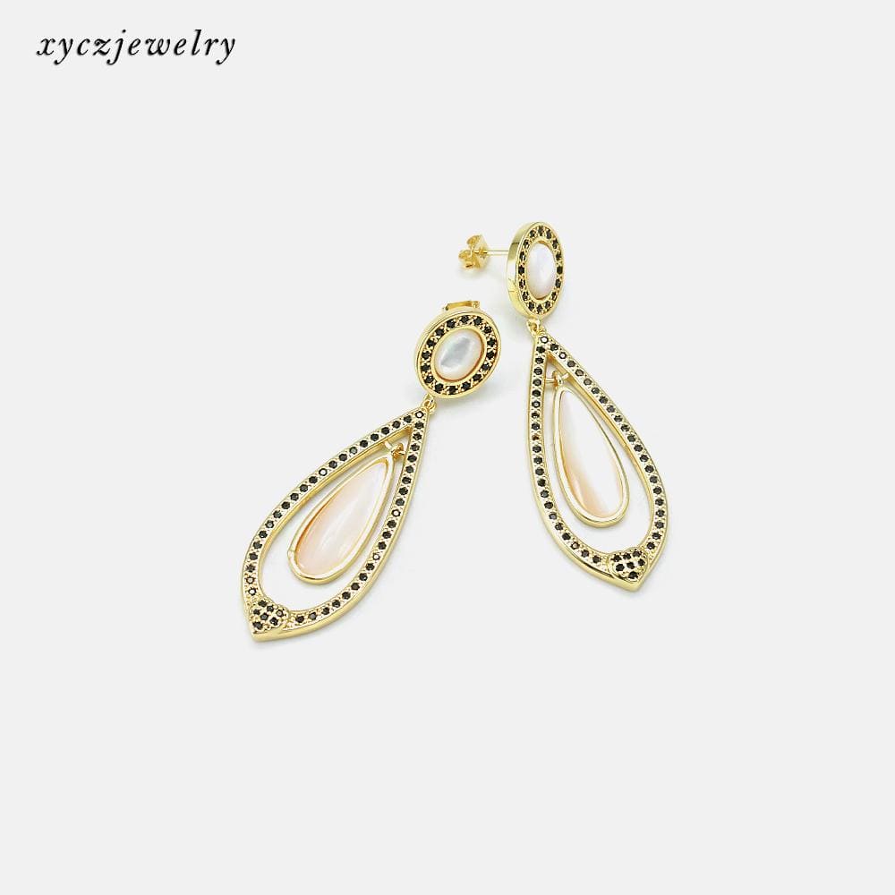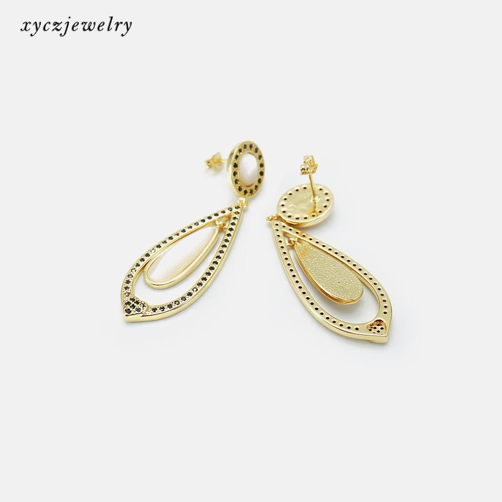 Brinco de alta fusão cravejado manualmente com micro zircônia 5A e madre pérola shell, nas opções de banho Ouro 18k, Ródio branco ou Bruto.