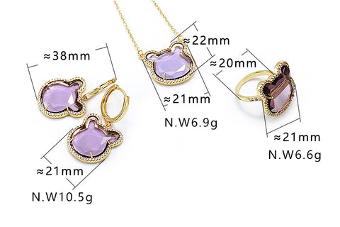 Conjunto de colar, brinco e anel em latão de alta fusão cravejado manualmente com micro zircônia 5A premium e vidro lapidado, nas opções de banho Ouro 18k, Ródio branco ou Bruto.