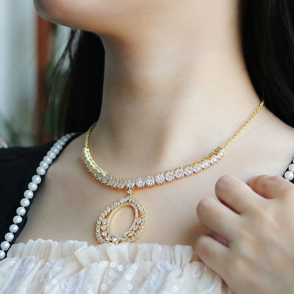 Colar em latão de alta fusão cravejado manualmente com micro zircônia 5A nas opções de banho Ouro 18k, Ródio branco ou Bruto.