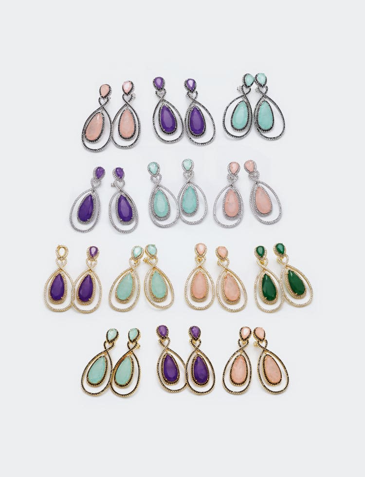 Brinco em latão de alta fusão cravejado manualmente com micro zircônia 5A premium e pedra fusion natural, nas opções de banho Ouro 18k, Ródio branco ou Bruto.