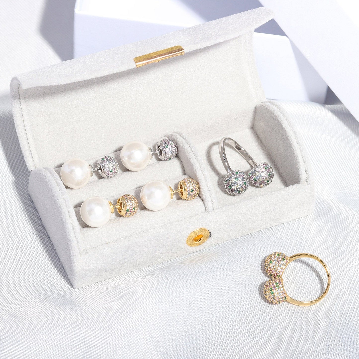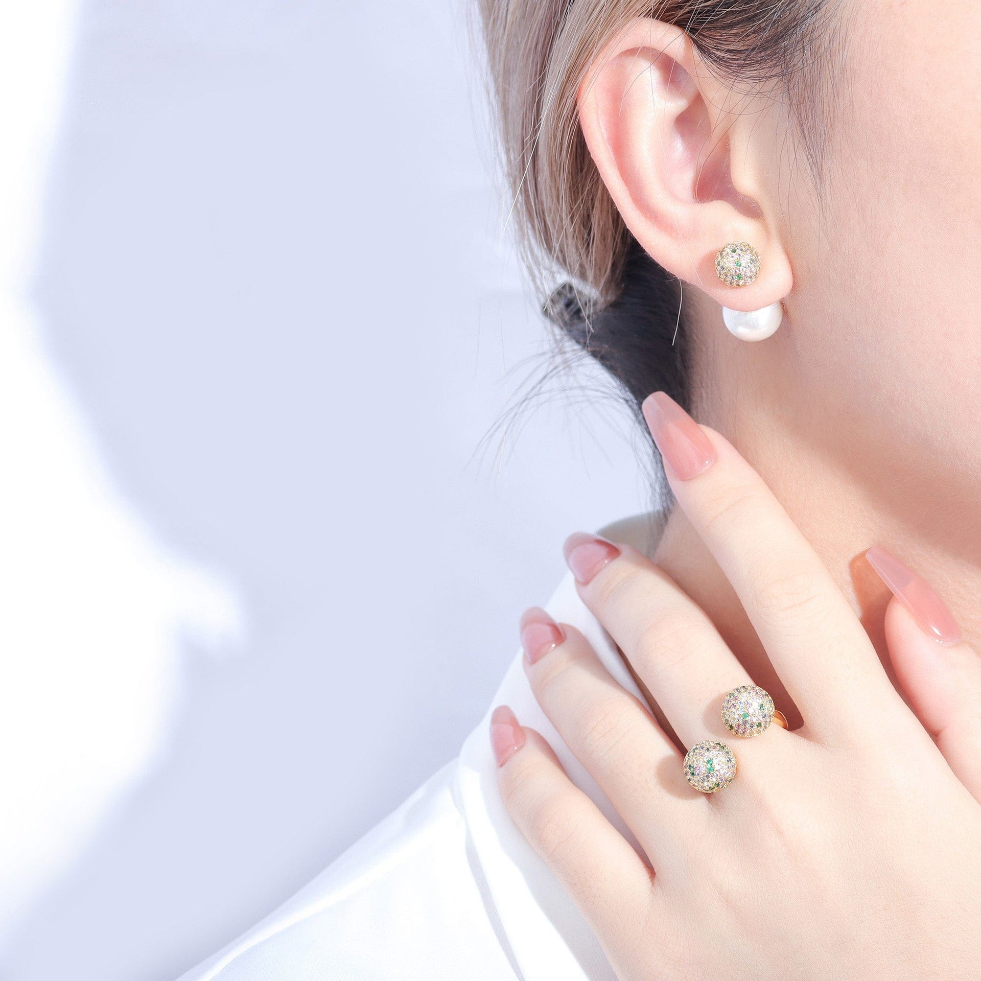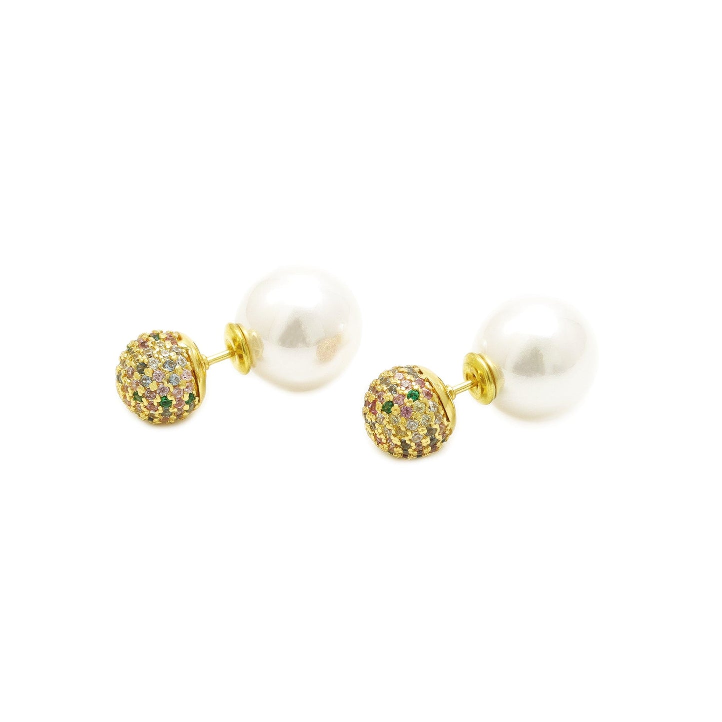 Brinco em latão de alta fusão cravejado manualmente com micro zircônia 5A premium e vidro lapidado, nas opções de banho Ouro 18k, Ródio branco ou Bruto.
