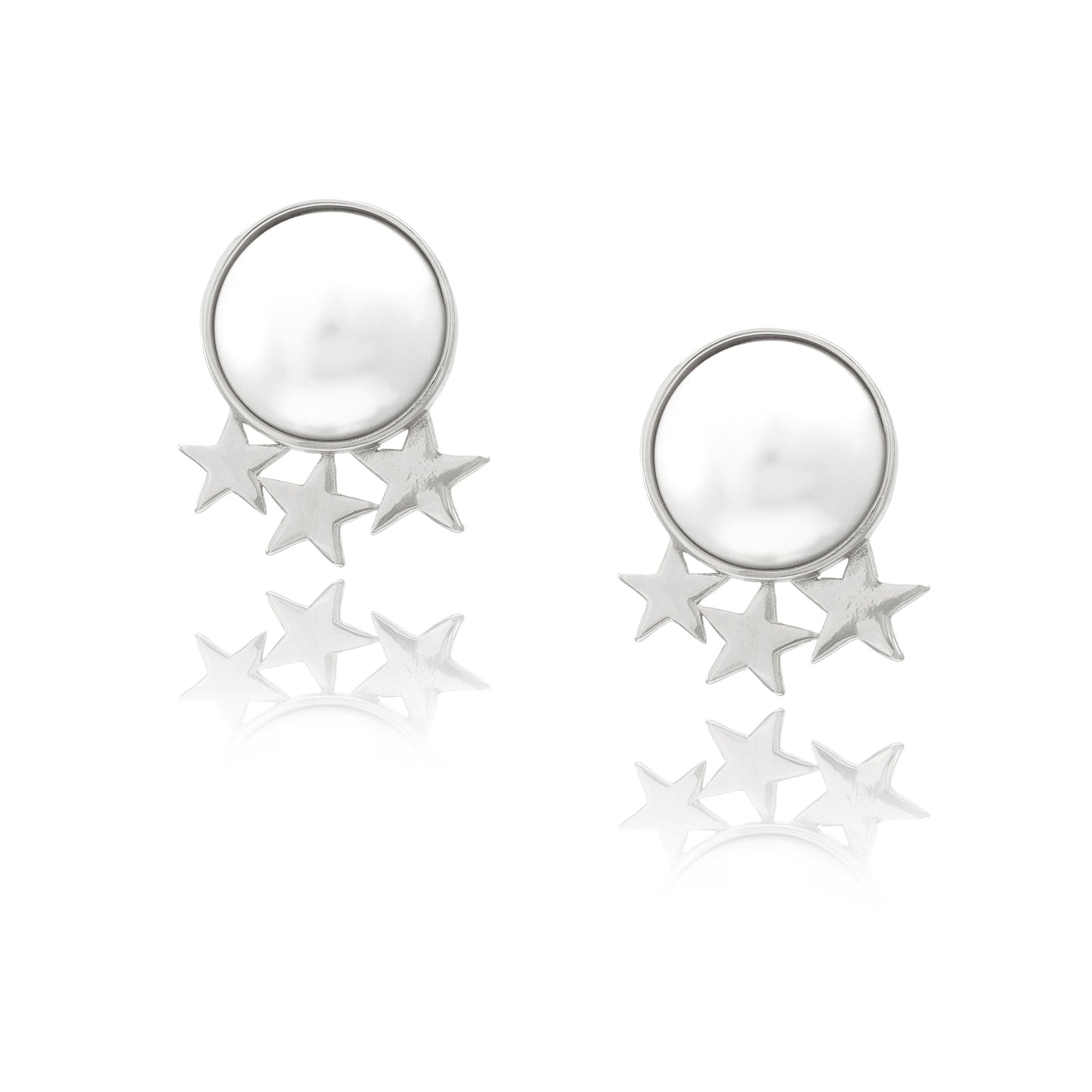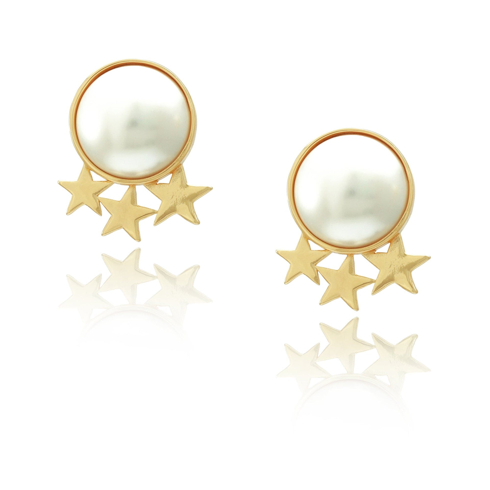 Brinco em latão de alta fusão cravejado manualmente com micro zircônia 5A premium e perola shell, nas opções de banho Ouro 18k, Ródio branco ou Bruto.
