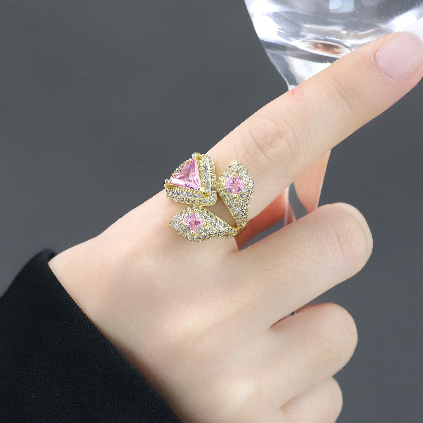 Anel em latão de alta fusão cravejado manualmente com micro zircônia 5A premium e vidro lapidado, nas opções de banho Ouro 18k, Ródio branco ou Bruto.