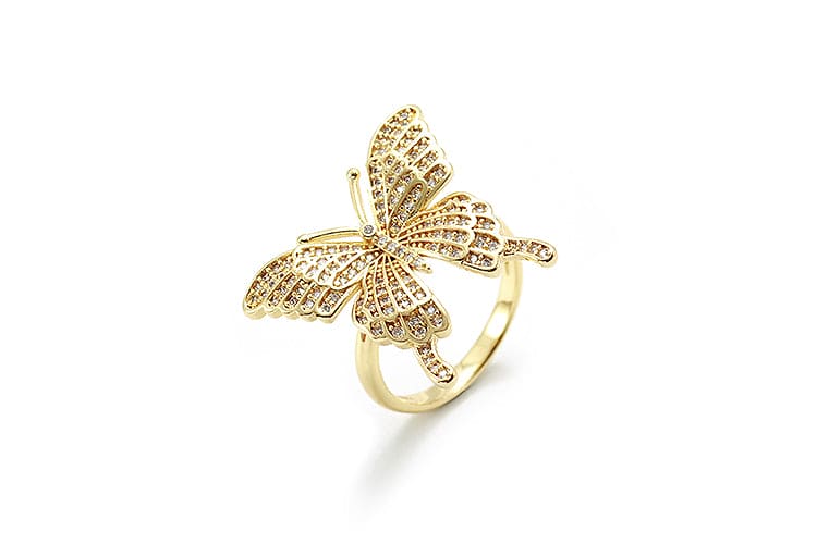 Compre anel borboleta cravejado com zircônias cristais no atacado para revenda com a melhor pedra de zircônia do mercado, a zircônia 5A, banho de Ouro 18K e garantia de 1 ano direto da fábrica. Tudo com a Xingyu, a marca de semijoias para o atacadista que mais cresce no mercado.