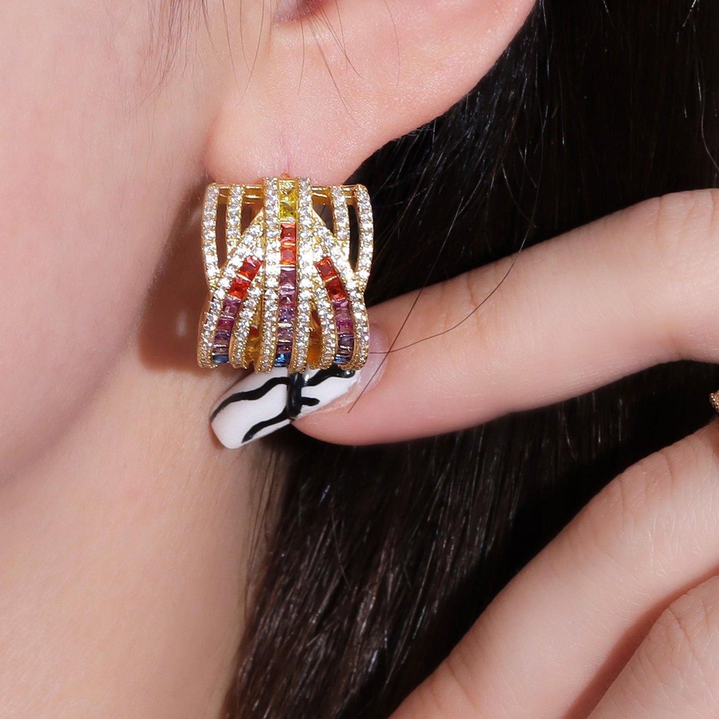Argola em latão de alta fusão cravejado manualmente com micro zircônia 5A premium e vidro lapidado, nas opções de banho Ouro 18k, Ródio branco ou Bruto.