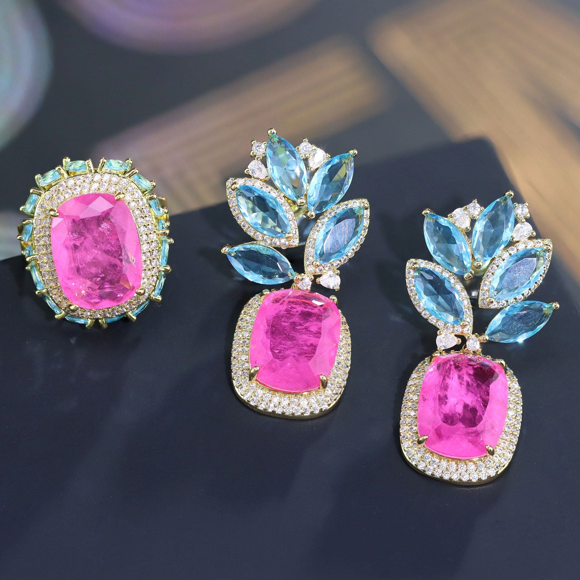 Pedra: Micro zirconia cristal, pedra fusion rosa pink e vidro lapidado em formato de navetes azul