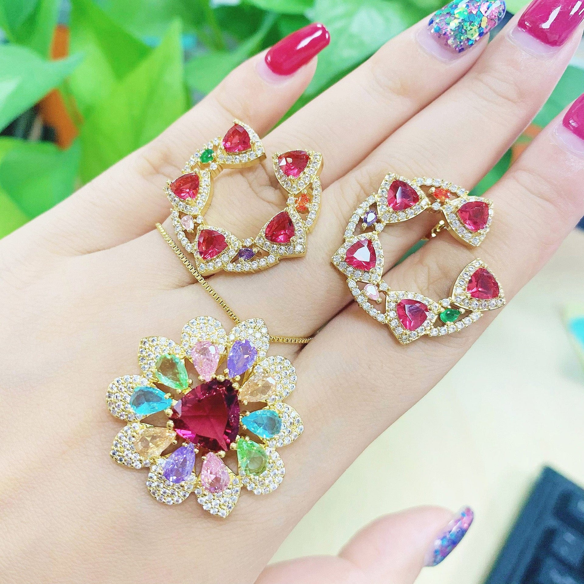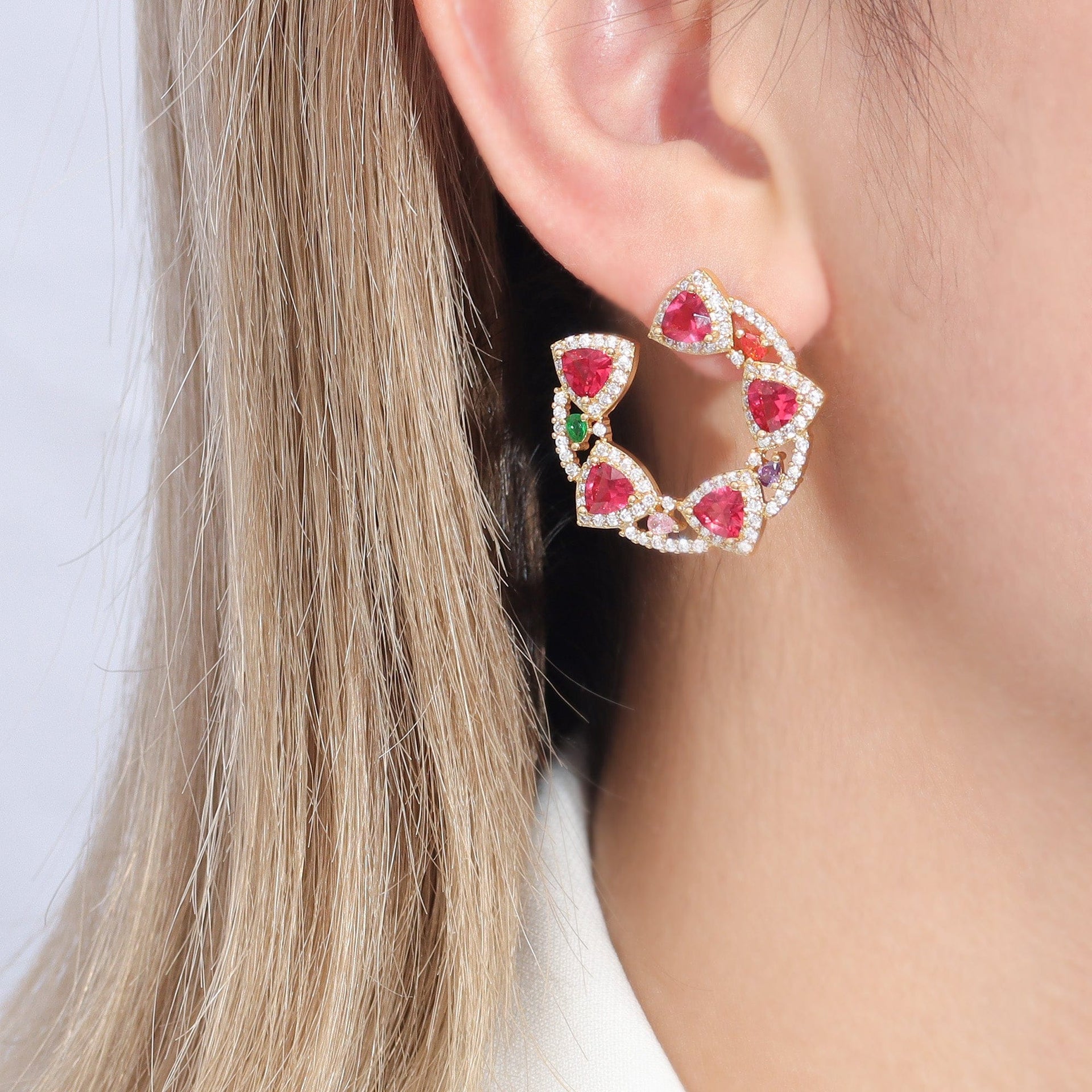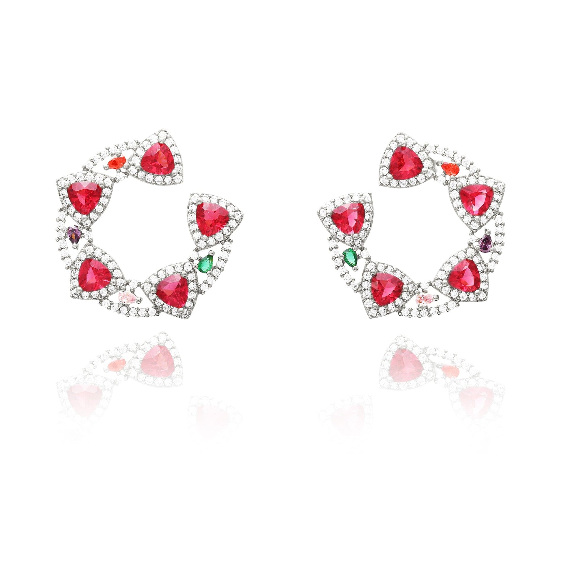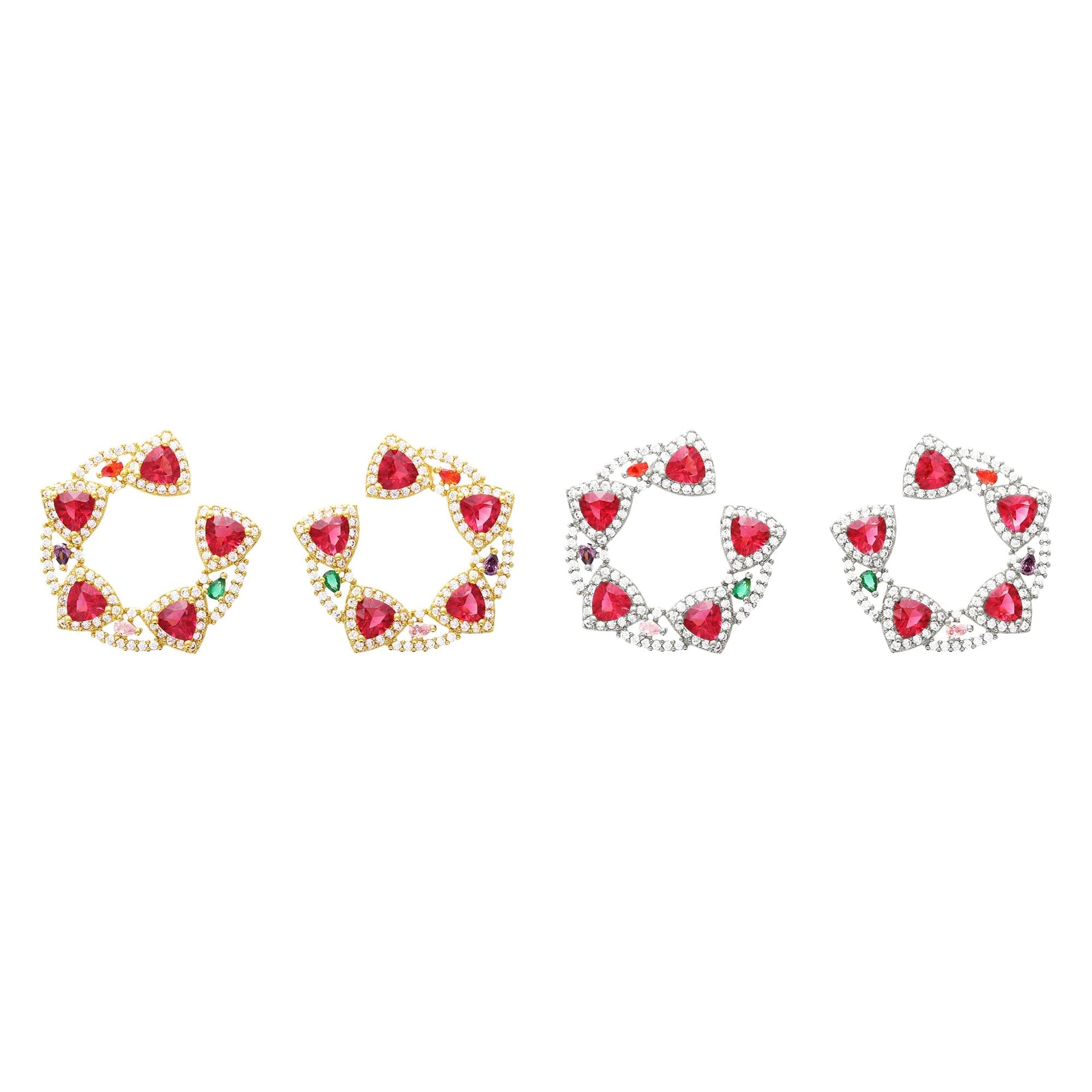 Brinco em latão de alta fusão cravejado manualmente com micro zircônia 5A premium e vidro lapidado, nas opções de banho Ouro 18k, Ródio branco ou Bruto.