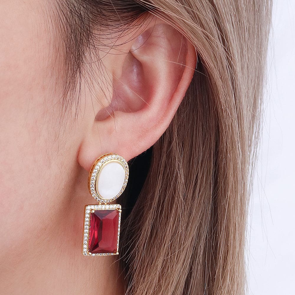 Brinco em latão de alta fusão cravejado manualmente com micro zircônia 5A Premium e vidro lapidado, nas opções de banho Ouro 18k, Ródio branco ou Bruto.